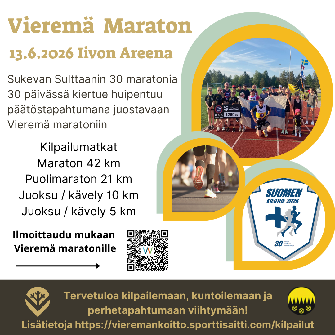 Tervetuloa mukaan tekemään historiaa lauantaina 13.6.2026, kun Vieremällä juostaan kaikkien aikojen ensimmäinen Vieremä Maraton! Tarjolla on matkoja jokaiselle vitosen kylän lenkistä kokomaratoniin.